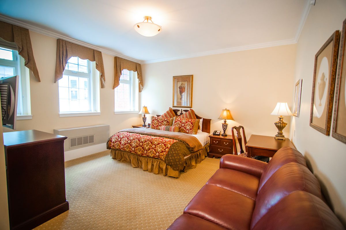 This room features one king bed with a pullout sofa and a mini refrigerator, and is located in the new Gothic Garden building.